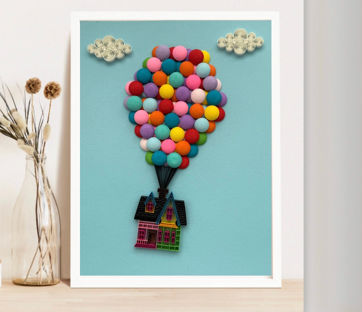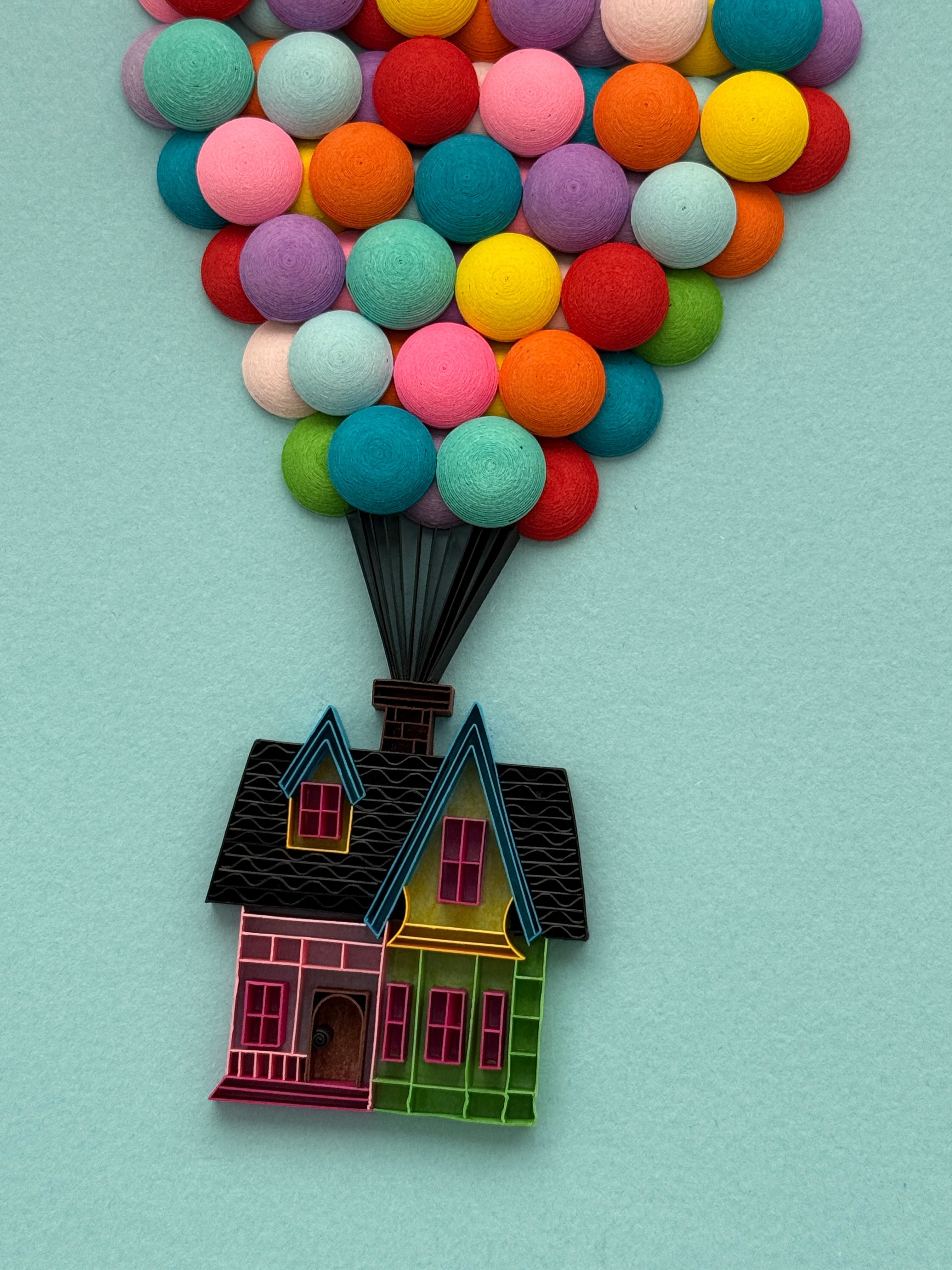 Inspired by the heartwarming movie Up, this artwork captures the magic of adventure and the comfort of home. With its colorful balloons and cozy little house, it’s a reminder to chase dreams, cherish love, and always keep your heart “up.”